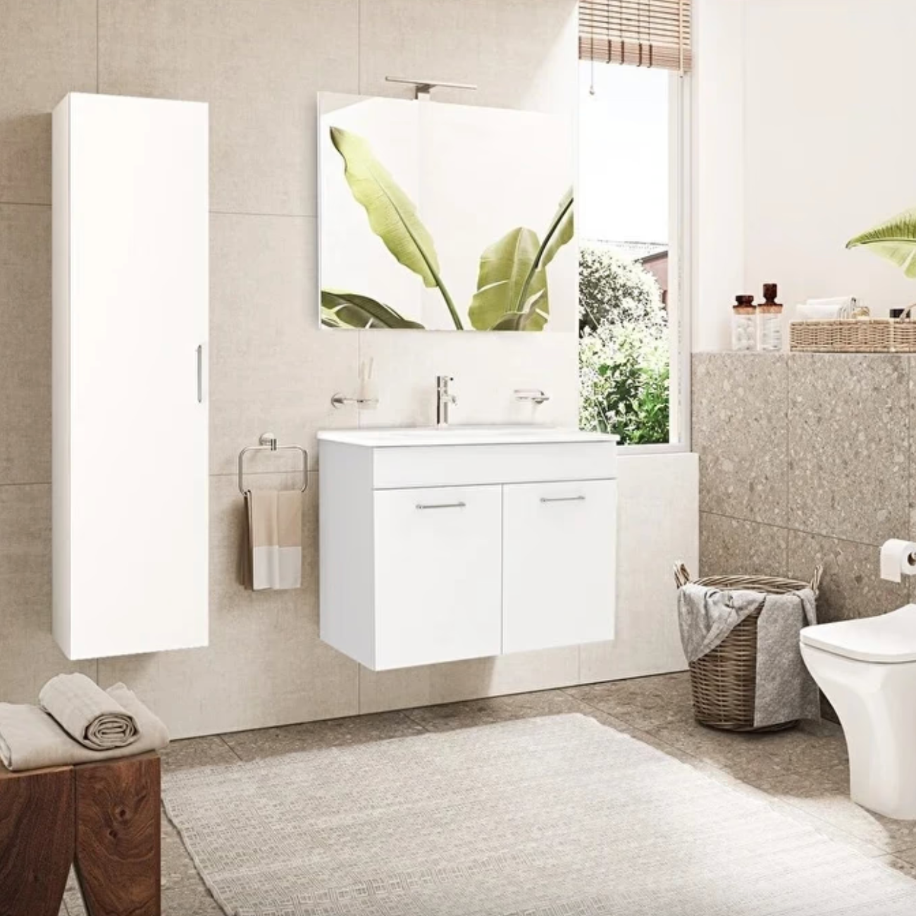 This 80 cm version replaces drawers with doors, offering a timeless design for those who prefer a more traditional storage solution. It includes a ceramic washbasin and an LED-lit mirror, all crafted with the same attention to quality and detail. Choose from four elegant color finishes to complete your bathroom's look.